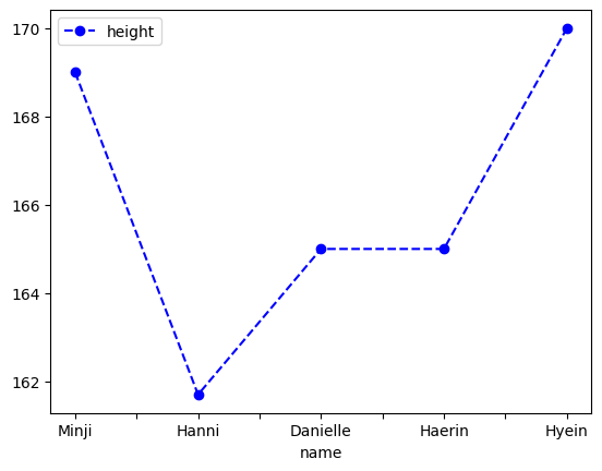newjeans.plot(x='name', y = 'height', color='blue', linestyle='--', marker='o')