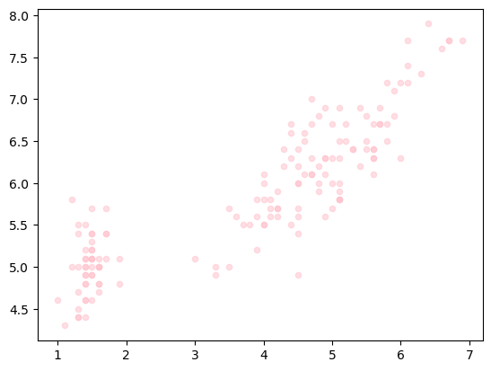 plt.scatter(iris['petal_length'],iris['sepal_length'], color='pink', s=20, alpha = 0.5)