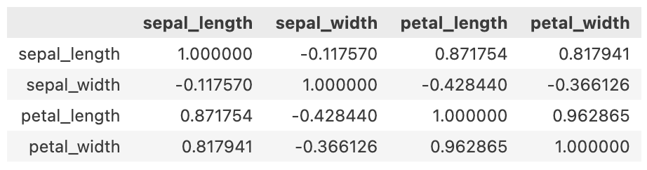 ๋ ๋ณ์ ๊ฐ์ ์ ํ์ ์ธ ๊ด๊ณ๋ฅผ ์ธก์ ํ๊ธฐ ์ํ ํต๊ณ์ ์ธ ๋ฐฉ๋ฒ ์ค ํ๋์ ๋๋ค. ์ฃผ๋ก ์ฐ์ํ ๋ณ์๋ค ๊ฐ์ ์๊ด๊ด๊ณ๋ฅผ ํ๊ฐํ๋ ๋ฐ ์ฌ์ฉ.#ํ์ด์ฌ์์ ์๊ด๊ณ์ ๊ตฌํ๊ธฐ(.corr) iris.corr(numeric_only=True)โ